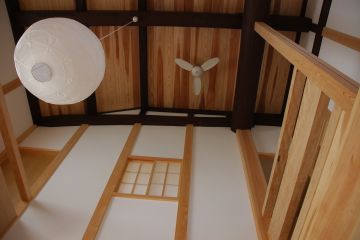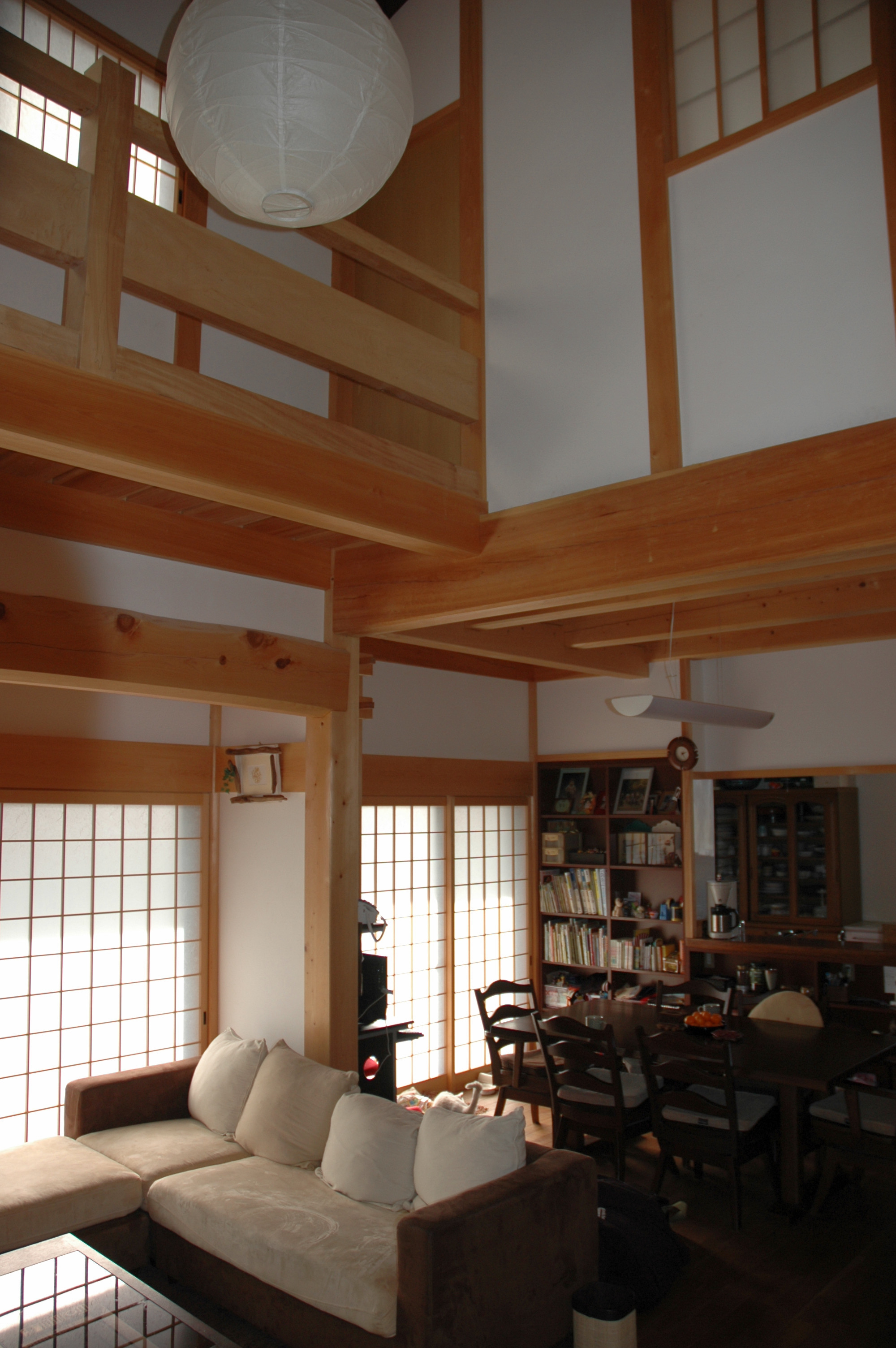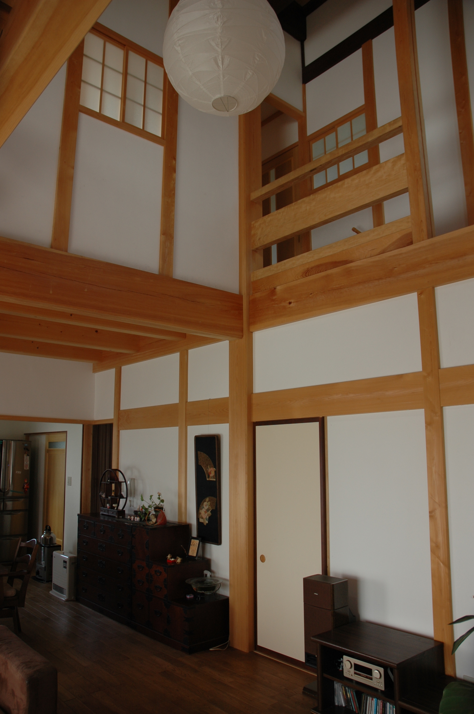 LDK部分は古民家のように構造を現し吹き抜けとしました。大黒柱は桧8寸角,壁は漆喰塗りです。